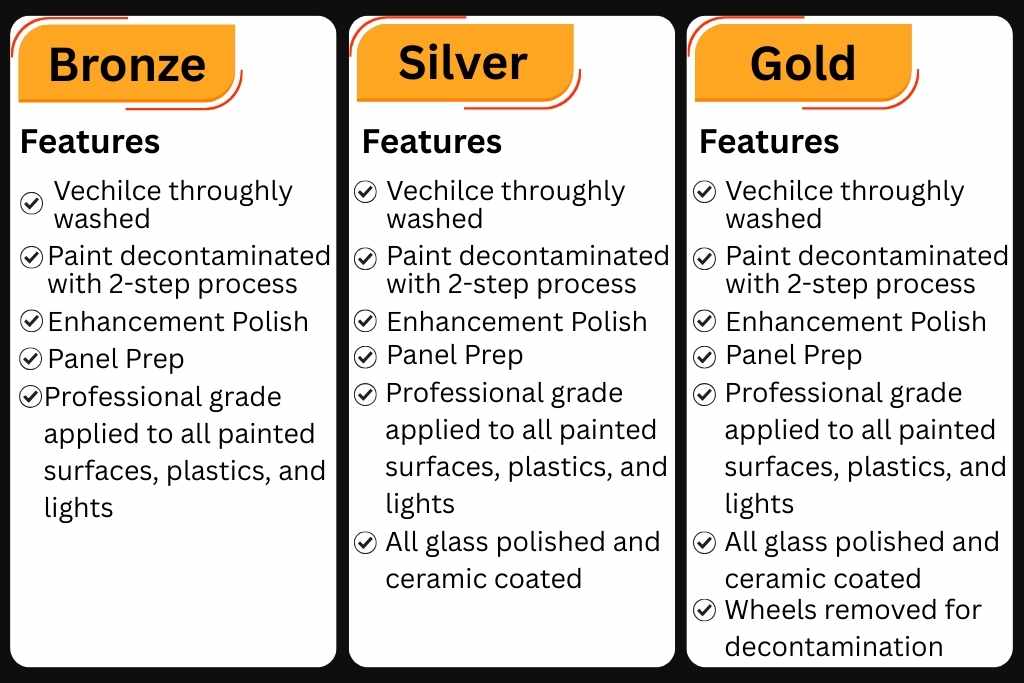 - Bronze Package: Delivers 1-year protection with Gtechniq Crystal Serum Light. Ideal for daily drivers, this package provides excellent gloss, water repellency, and UV resistance, keeping your car cleaner and shinier with minimal maintenance.